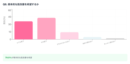 その結果、「とても思う」が36.0%、「やや思う」が43.0%で、合わせて79.0%の方が根本的な肌改善を希望していることが明らかになりました。