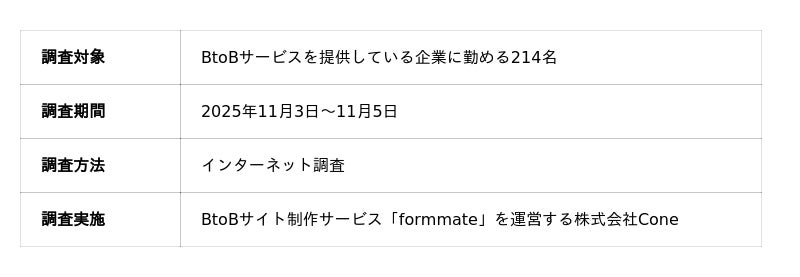株式会社Cone(本社:大阪府大阪市、代表取締役:佐藤 立樹)は、BtoBサービスを提供している企業のマーケティング担当者214名を対象に、「BtoBフォーム設計とリード獲得」に関する実態調査を実施しました。