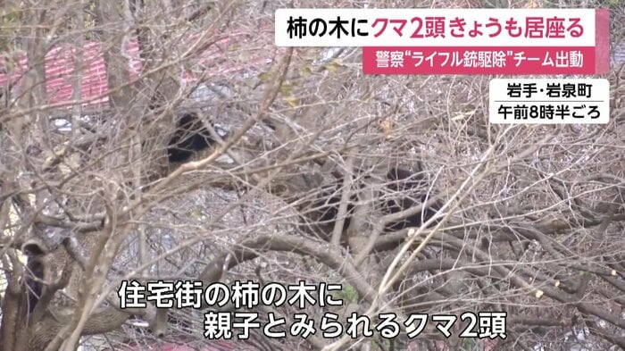 17日にクマ2頭が半日にわたって居座った岩手県岩泉町の住宅街の柿の木に、再び2頭が現れた。ライフル銃での駆除を担う警察のプロジェクトチームが出動したという。