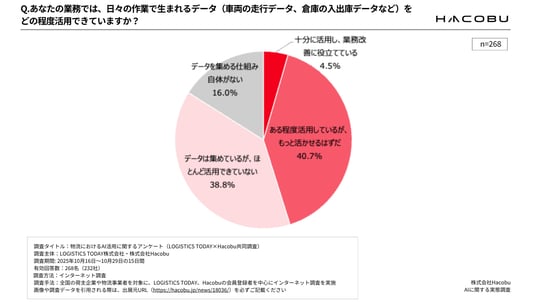 日々の業務データの活用度では「ある程度活用しているがもっと活かせるはずだ(40.7%)」、「データは集めているがほとんど活用できていない(38.8%)」が上位となり、データ収集と利活用の間に大きなギャップが存在しています。
