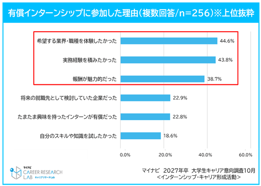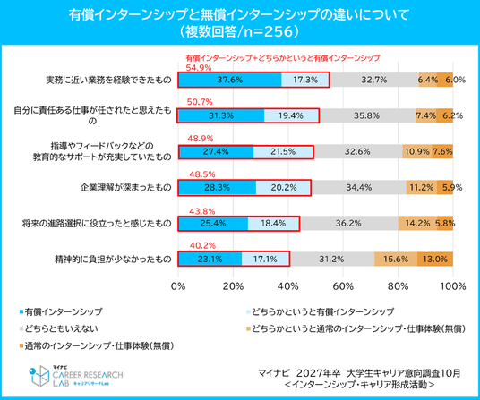 交通費や昼食代以外の給与が支払われるような「有償インターンシップ」に参加したことのある割合は17.8%だった。参加した理由を聞くと、「希望する業界・職種を体験したかった(44.6%)」が最多で、次いで「実務経験を積みたかった(43.8%)」、「報酬が魅力的だった(38.7%)」となった。また、「有償インターンシップ」と「無償インターンシップ」の違いについて聞いたところ、「実務に近い経験ができたもの(54.9%)」が最多で、次いで「自分に責任ある仕事が任されたと思えたもの(50.7%)」「教育的なサポートが充実していたもの(48.9%)」となったが、いずれの項目も「有償インターンシップ」が高い結果となった。「有償インターンシップ」は報酬があることで社会人としての労働の対価を得る経験ができるほか、「無償インターンシップ」よりも実務性や責任感を伴う経験ができることで、結果として学びの質が向上するという効果が期待できる。【図4、5、6】