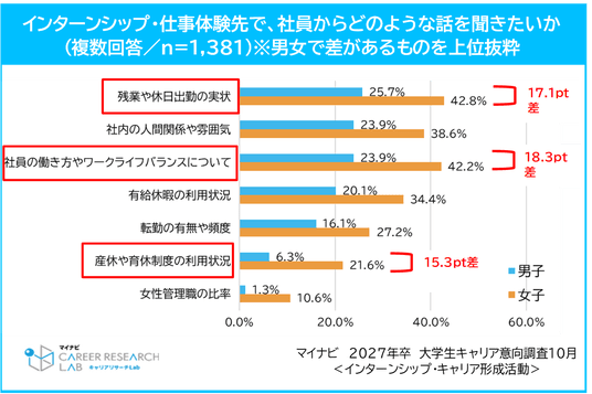 今回の調査では、女子学生が「社員の働き方やワークライフバランス」「残業や休日出勤の実態」「産休・育休制度の利用状況」といった項目を男子学生よりも高い割合で選んでいることが明らかになりました。女性のキャリア形成において、長期的なライフプランや働きやすさへの関心が高いので、企業としては働き方や制度の透明性を高め、学生に対して積極的に情報発信することが、将来の多様な人材確保に向けた重要な取り組みとなるでしょう。