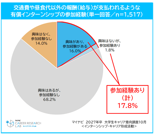 ◆給与が支払われる「有償インターンシップ」の参加率は17.8%。「有償インターンシップ」では、実務性や責任感を伴う経験ができたという声も