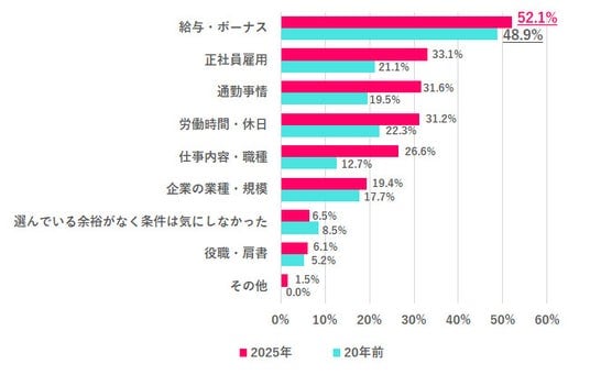 転職したことがある人に転職した時に妥協した条件を聞いたところ、2025年も20年前も「給与・ボーナス」が最多で、半数程度の人が回答しました。2位と3位はそれぞれ、2025年は「正社員雇用」と「通勤事情」、20年前は「労働時間・休日」と「正社員雇用」でした。
