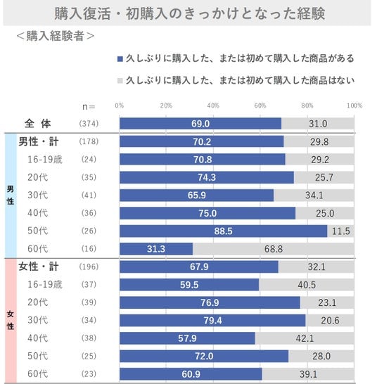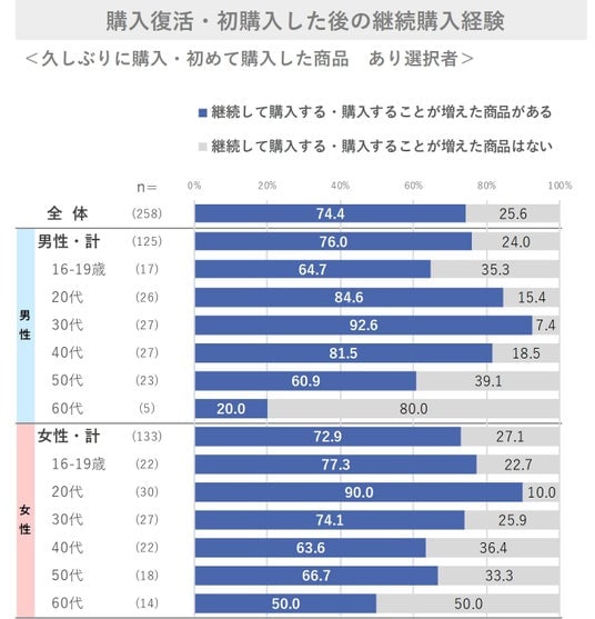 また、久しぶりに購入・初めて購入した商品がある人の中で、その後に通常の商品を継続・購入が増えた割合は74.4%を占めています。