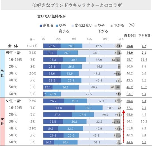 「コラボ」先による購入意向の変化は、1.好きなブランド・キャラクターの場合は、全体では「高まる計」が50.8%を占めます。女性の若年層ほど購入意向が高まる傾向です。