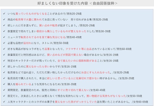 「数量限定・期間限定」によって、全体では「好ましくない印象を受けたことがある」7.5%、「やや受けたことがある」21.6%で、合わせて約3割が好ましくない印象を受けた経験がある。要因としては「買い占めや転売による入手のしづらさ」や「店舗の混雑」に対する嫌悪感、「普段のユーザーが買いにくくなる」など。