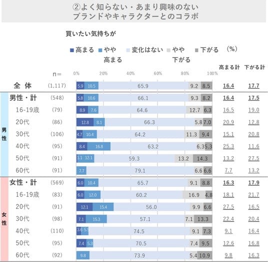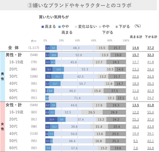 好きなブランド・キャラクターとの「コラボ商品」では、全体の50.8%が「買いたい気持ちが高まる」。よく知らない・あまり興味のないブランド・キャラクターとの「コラボ商品」では、全体の65.9%は「買いたい気持ちに変化はない」。嫌いなブランド・キャラクターとの「コラボ商品」では、全体の37.2%で「買いたい気持ちが下がる。