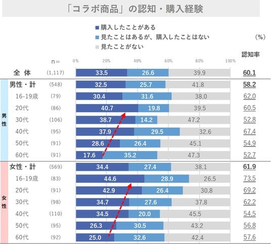 1.「コラボ商品」の認知・購入実態「コラボ商品」の認知率は全体で60.1%、購入経験率は全体で33.5%です。購入経験率は男女それぞれ若年層ほど高くなる傾向でした。