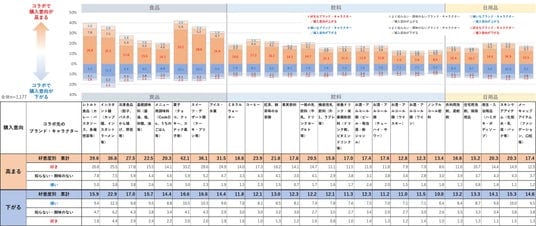 コラボ先による購入意向への影響は、各商品カテゴリーそれぞれコラボ先に好意を持てた場合に購入意向が高まる効果が最も高くなり、嫌いな場合に購入意向が下がる影響を上回り、各商品の購入意向は、コラボ先が「好き」な場合は購入意向は1割~3割前後高まりますが、「嫌い」な場合に購入意向が下がるのはいずれの商品も1割前後に留まります。コラボ先が「知らない・興味のない」場合の購入意向の変化は、購入意向が高まる・下がるはそれぞれ5%前後です。「嫌い」なのに高まる、「好き」なのに下がるはほとんどが数%でした。