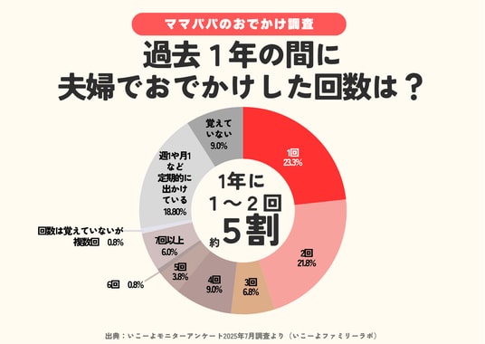 子育て中の夫婦の約6割が「この1年間で夫婦だけのデートはゼロ」と回答。一方で、夫婦でおでかけした9割以上が「今後も夫婦2人の時間を取りたい」と希望しています。「預け先の確保」や「子供の心配」など「夫婦2人」の「おでかけ時間」と「おうち時間」について抜粋して紹介します。