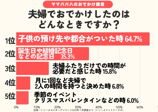 夫婦でおでかけしたときについても聞きました。圧倒的な1位が「子供の預け先や都合がついた時」(64.7%)。