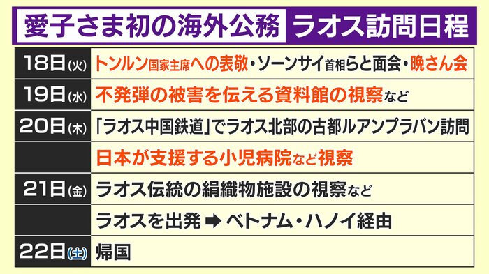 今後、愛子さまは、トンルン国家主席への表敬や、首相らとの面会・晩さん会に出席される他、不発弾の被害を伝える資料館や、日本が支援する小児病院、ラオス伝統の絹織物施設などを視察する予定です。