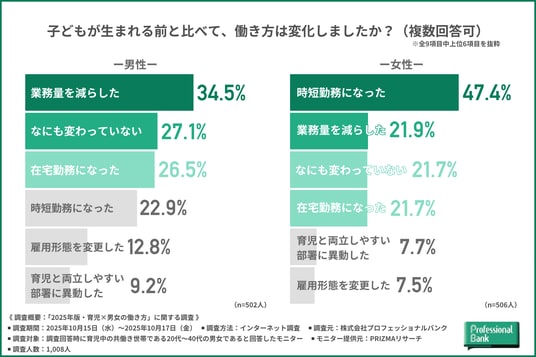 「子どもが生まれる前と比べて、働き方は変化したか」と質問したところ、男性は『業務量を減らした(34.5%)』が最も多く、次いで『なにも変わっていない(27.1%)』『在宅勤務になった(26.5%)』となりました。