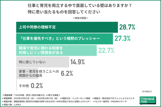 男性限定の質問として、「仕事と育児を両立する中で直面している壁」について尋ねたところ、『上司や同僚の理解不足(28.7%)』『“仕事を優先すべき”という暗黙のプレッシャー(27.3%)』『職場で育児に関わる制度を利用しにくい雰囲気がある(22.7%)』が上位に挙がりました。