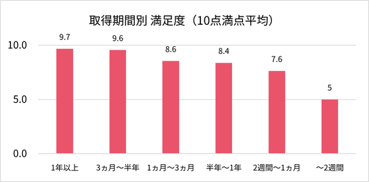 - 最も満足度が高いのは「1年以上」取得した層(平均9.7点/10点満点)