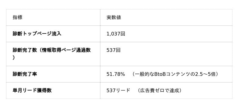 - 診断公開から3ヶ月で自然拡散が発生し、月500リード超の安定獲得を実現