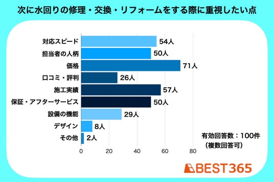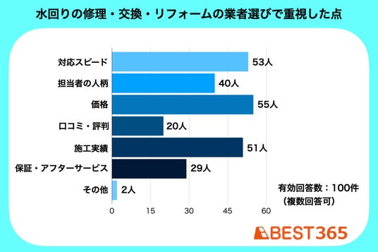 今回のアンケート調査では、水回り業者を選ぶ際には「価格・対応力・人柄・施工品質」を重視する人が多い結果となりました。