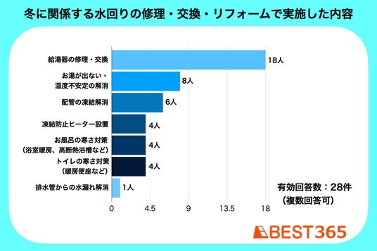 冬の寒さによる修理・交換・リフォームの内容のうち、最も多かったのは「給湯器の修理・交換(28人中18人が回答)」でした。また「浴室の寒さ対策(浴室暖房などの設置)をした」など、寒さに備えた対策を意識している方も見られました。
