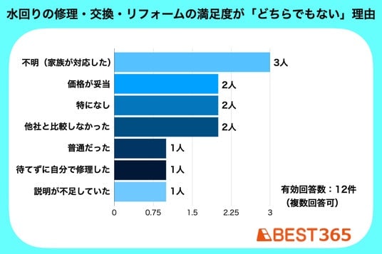 「どちらでもない」と回答した理由には「不明(家族が対応したため)」「他社と比較しなかった」といったものや、「待てずに自分で修理した」「説明が不足していた」など、業者の対応が不十分だった内容もありました。