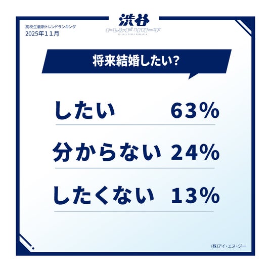 結婚願望がある高校生は63%という結果に。昨年の同調査では77%が「結婚したい」と回答しており、結婚願望を持つ高校生は減少傾向にあることがうかがえます。「結婚は憧れるけど、恋愛したことがないからイメージがわかない」(高1・女子)といった声のほか、「離婚する人が多いから」(高3・男子)といった意見も見られ、結婚に対する憧れはある一方で、実際の結婚生活へのイメージをポジティブに持ちきれない高校生も多いようです。