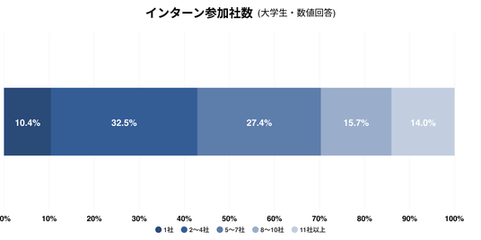 インターンシップへの参加率は非常に高く、また、複数社に参加している学生が多数を占める。平均で6.58社のインターンに参加しており、11社以上の経験を持つ学生も一定数確認できる。