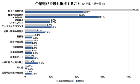 就職活動の開始当初と比べると、学生が企業選びで重視するポイントに変化が見られた。「仕事内容の魅力・やりがい」は開始当初よりも上昇(+7.6pt)し、現時点では最も重視される項目となっている。一方で、「給与・報酬水準」は大きく低下(-19.3pt)した。一定の給与水準が前提として満たされているうえで、仕事の中身や人・環境といった要素をより重視する傾向が強まっている。
