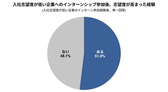 入社志望度が低い企業のインターンに参加した学生のうち、約半数(51.9%)が「参加後に志望度が高まった経験がある」と回答した。当初は関心が低かった企業であっても、実際に社員や業務内容に触れることで印象が変化するケースが多いことが明らかになった。