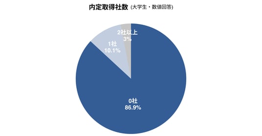 10月時点ですでに内定(内々定)を獲得している学生は13.1%と一部にとどまり、全体としては少数派である。1社以上の内定取得社数の内訳は、1社が大半を占め、複数内定取得者は全体の3.0%だった。サマーインターン期を経て、選考時期の早い一部の企業群を中心に内定が出始めていることがうかがえる。