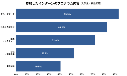 参加したインターンのプログラム内容として最も多いのは「グループワーク」93.3%で、ほぼすべての学生がこの形式を経験している。「会社・職場見学」「実務体験」といったプログラムは比較的参加率が低い。