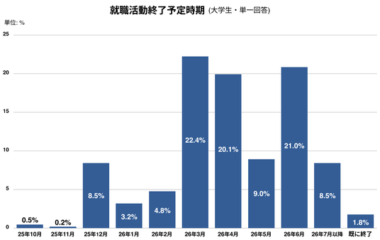 就職活動の終了予定時期は、3年生の間を想定する割合(2025年10月~2026年3月までの合計)が約4割にのぼる。月別に見ると、3年生3月(2026年3月)が22.4%で最も多く、次いで4年生6月(2026年6月)の21.0%の順となった。選考時期の早い企業群の志望者と、それ以外の企業群の志望者で傾向が異なる様子がうかがえる。