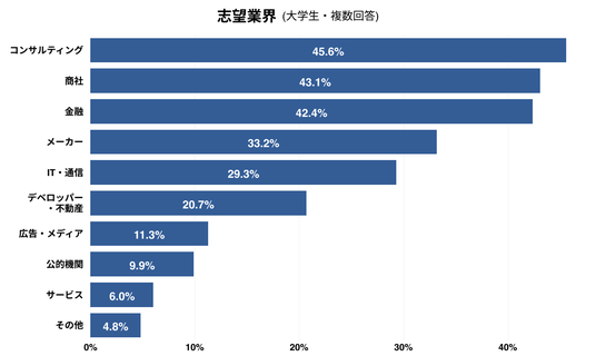 志望業界はコンサルティング、商社、金融が拮抗して多い。一方で、最も志望する業界では、コンサルティング、商社の2業界が拮抗する結果となり、両業界の人気の高さを反映する結果となった。