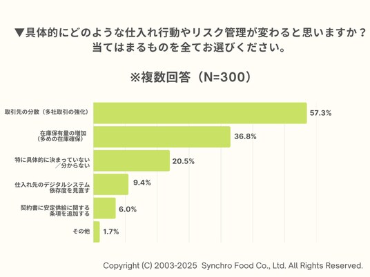 前の質問で、「変わると思う」と回答した117名に、具体的にどのような行動やリスク管理が変わると思うか聞いたところ、「取引先の分散(多社取引の強化)」が57.3%と最も多い結果に。次いで「在庫保有量の増加(多めの在庫確保)」(36.8%)が続きます。