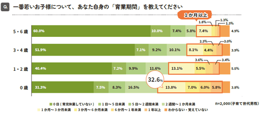 〇男性の育業取得率は増加傾向。0歳児パパの育業取得率は約65%。そのうち約33%が1か月以上育業し、半数が「次の機会があればまた育業したい」と育業経験を前向きに受け止めている。