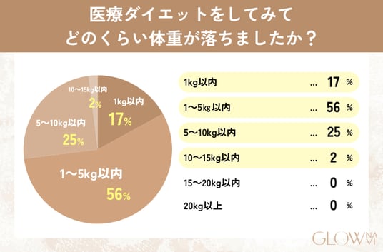 - 医療ダイエットにより「1~5kg体重が落ちた」と答えた人が過半数