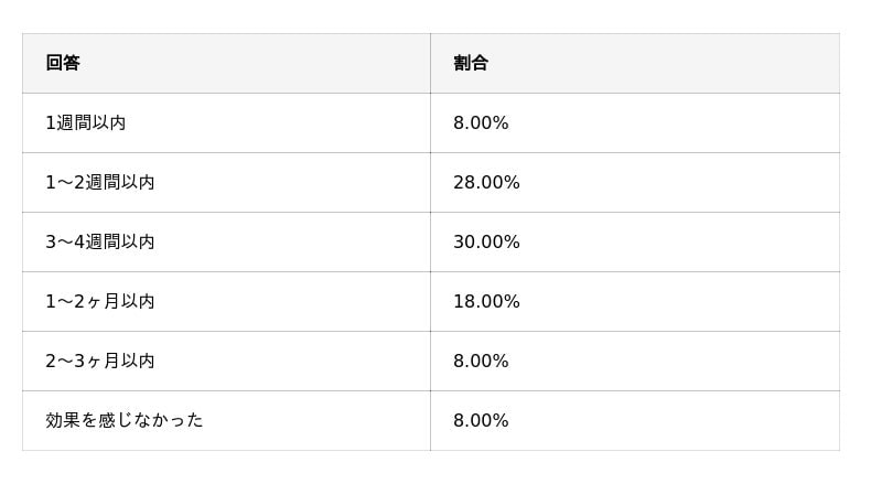 効果が出るまで、「1~2週間以内」「3~4週間以内」と答えた人が全体の過半数となりました。