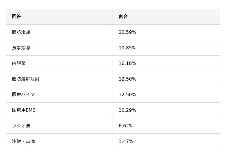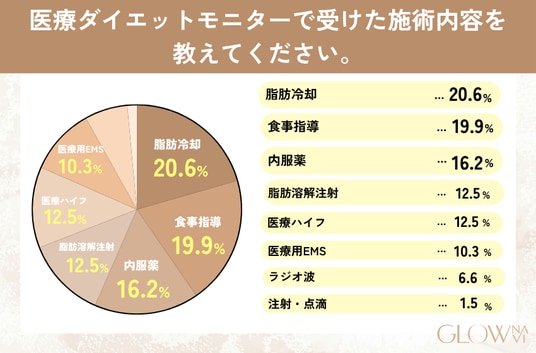 - 医療ダイエットモニターでは、「脂肪冷却」を受けた人が20.6%で最多