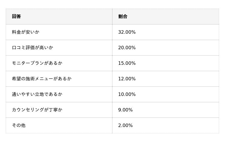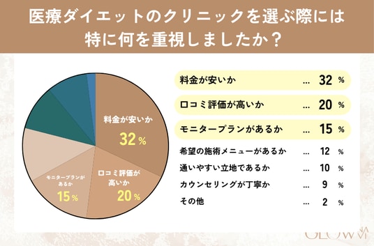 クリニック選びの際に「料金の安さ」を重視したと答えた方は32%でした。