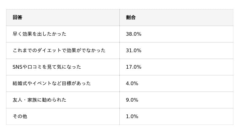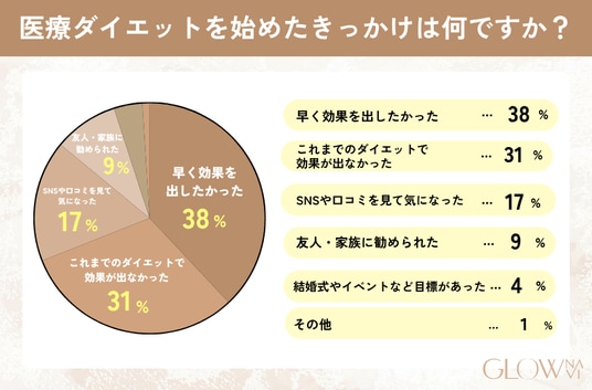 - 医療ダイエットを始めた理由は「早く効果を出したかった」が全体の約4割
