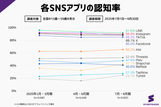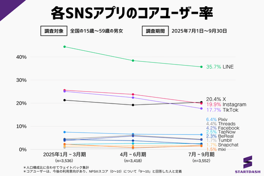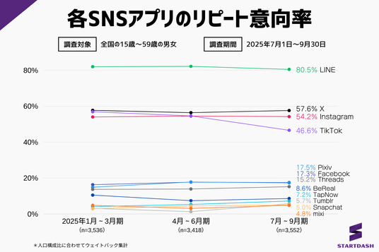 認知から利用、リピート意向、コアユーザー獲得状況まで。2025年7~9月期の最新データで読み解くSNSアプリ市場の動向。