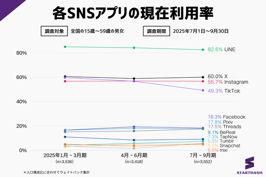 ・『LINE』が現在利用率82.6%で首位独走、2位『X』は60.0%