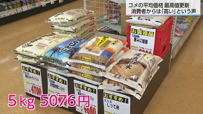 11月9日までの1週間に販売されたコメの平均価格が5kgあたり4316円となり、過去最高を更新した。宮崎市のスーパーでは、5kgあたり5000円を超える商品もあり、消費者の間からは価格への懸念や、パンなどで代用するという声も聞かれた。
