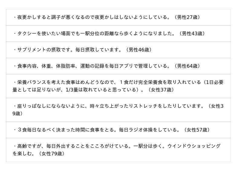 健康維持のために実施していることやできていないこと、続けたいことなどについて聞いています。調査結果をお知らせいたします。