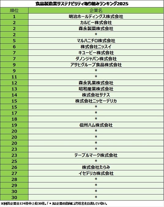 こうした背景のもと、公益財団法人流通経済研究所は、全国の食品製造企業を対象にサステナビリティへの取り組み状況を調査しました。その結果、ランキング1位は明治ホールディングス、2位は同率でカルビーと森永製菓となりました。