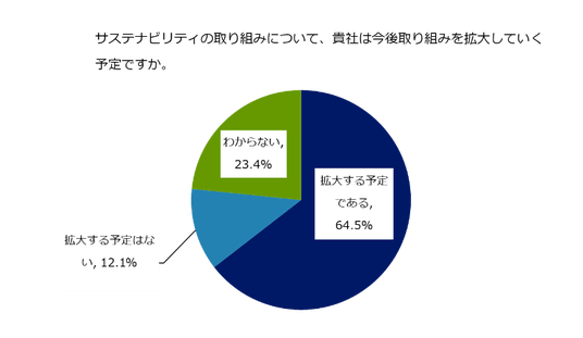 今後、サステナビリティへの取り組みを「拡大する予定である」と回答した企業は64.5%にのぼり、多くの企業が取り組みの強化を進めていることがわかります。
