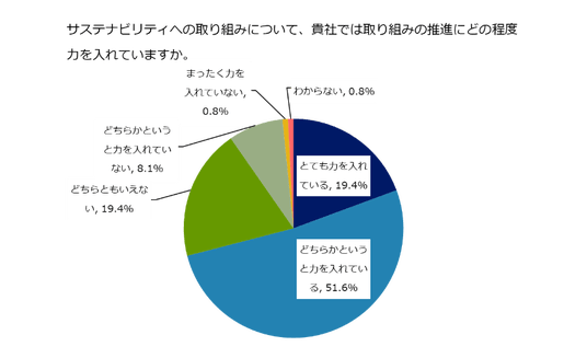 サステナビリティへの取り組み推進に「とても力を入れている」のは19.4%、「どちらかというと力を入れている」のは51.6%であり、合わせて71.0%と取り組みが広がっていることがうかがえます。ただし、「とても力を入れている」だけ見ると2割強にとどまっており、依然として積極的に取り組んでいる企業は限られています。