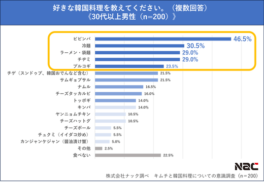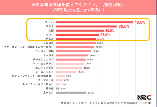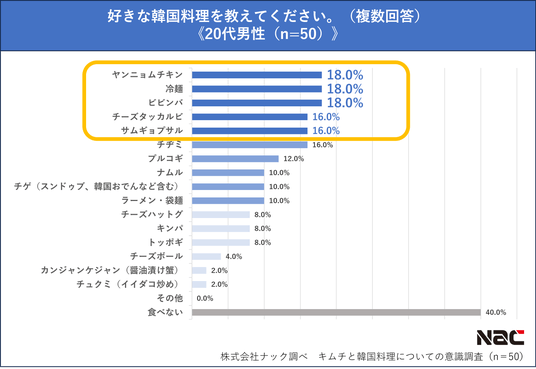 2.好きな韓国料理は「ビビンバ」が約4割を占めて全体1位。一方、20代は「ヤンニョムチキン」が1位となり、他の世代と異なる結果に
