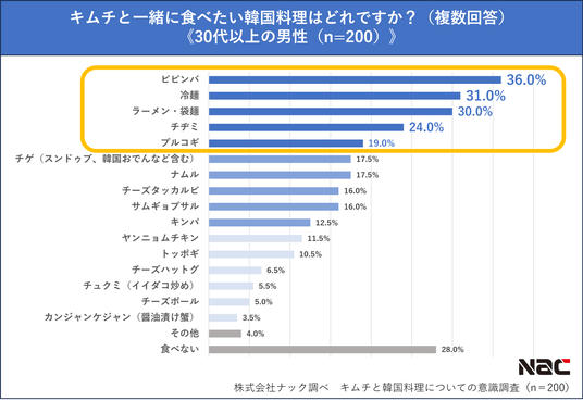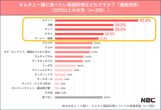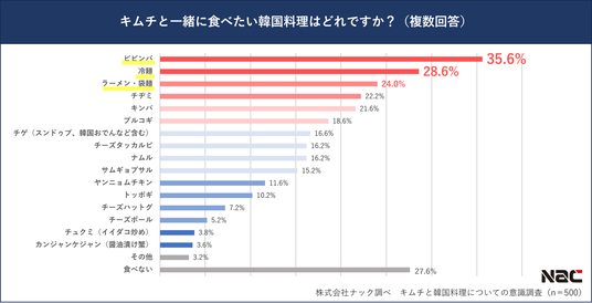 3.キムチと一緒に食べたい韓国料理も「ビビンバ」が35.6%で全体1位。20代男性には「冷麺」、 20代女性には「キンパ」が人気