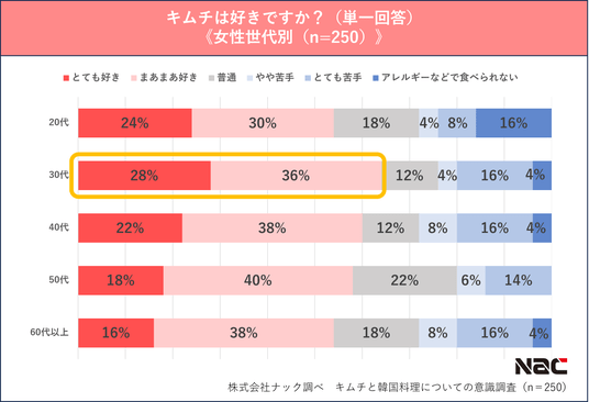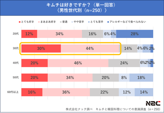 男女世代別で見ると、 「とても好き」「まあまあ好き」と答えた人は男女ともに30代が最も多く、男性30代で74.0%、女性30代で64.0%を占めました。また、男女ともに40代が2番目に多く、キムチは30~40代の世代に特に人気であることが分かります。