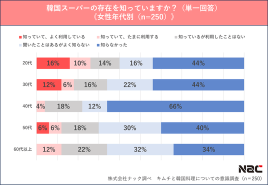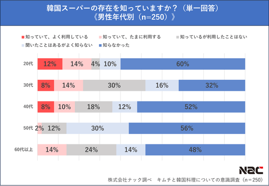 男女ともに「知っていて、よく利用している」のは20代が最多となり、若い世代が最もよく利用していることが分かりました。「知っていて、たまに利用する」も含めると利用経験はほとんどの世代で男性が多い一方、女性は男性に比べて、50~60代でも韓国スーパーを知っている人が多い結果となりました。